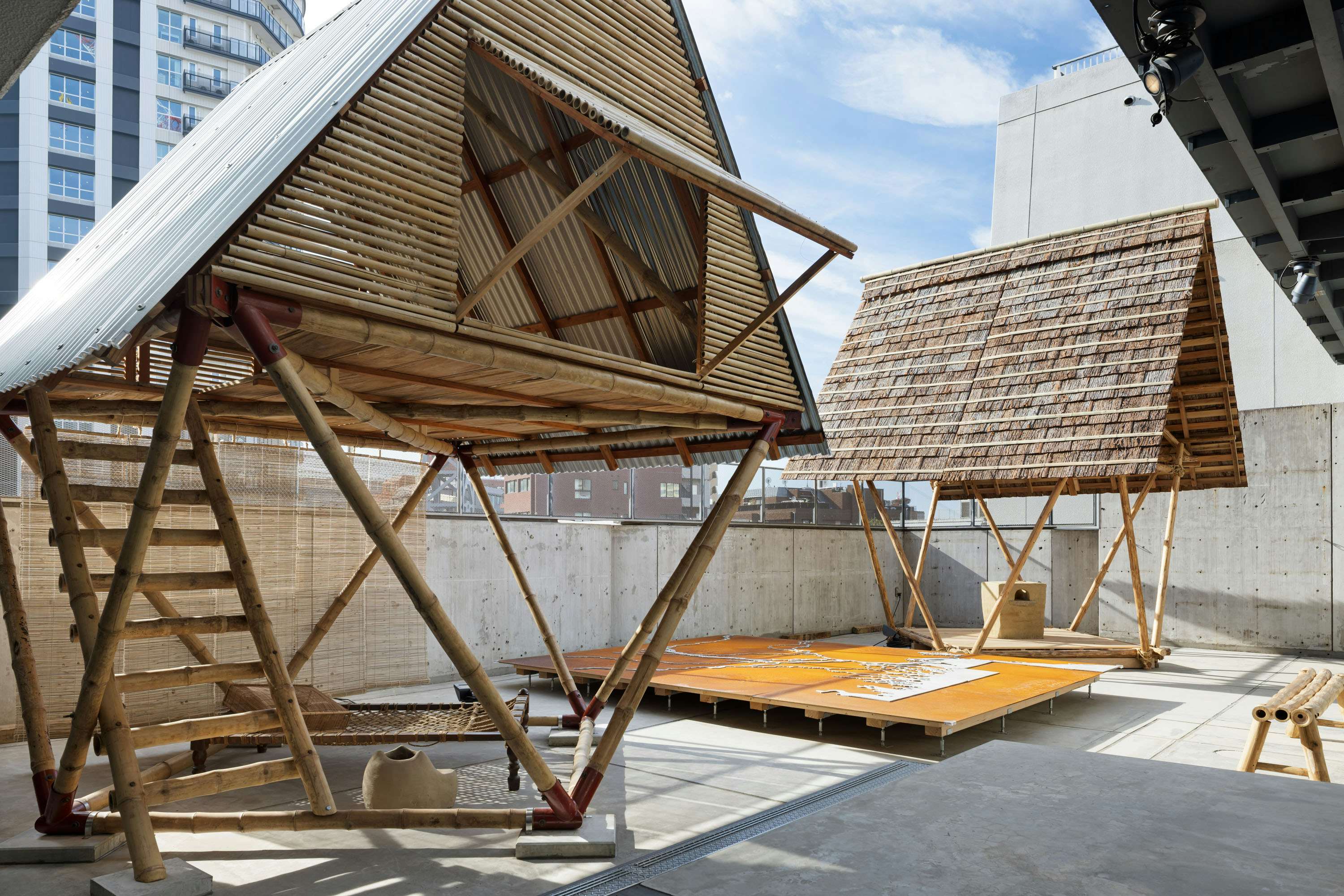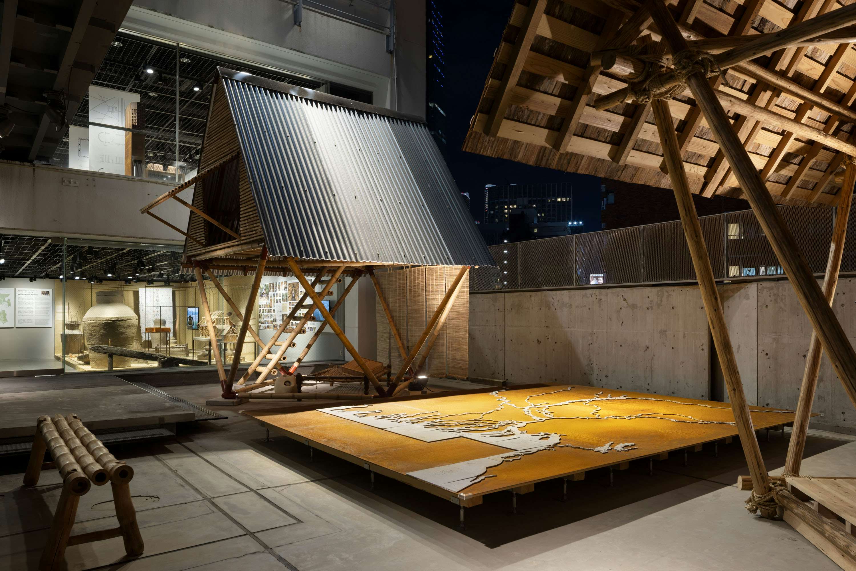 MTAを代表するプロジェクトのひとつが、バングラデシュのデルタ地帯における洪水多発地域で実践されてきた「クディ・バリ(小さな家)」である。気候変動と経済格差の拡大により、土地の所有権を持たない人々は、より危険な地域への居住を余儀なくされている。洪水によって土地を失い、恒常的な移動を強いられる人々のために、このプロジェクトはコロナ禍にMTAの自主研究として始動した。およそ一棟500ドルという低コストで、竹とスチールジョイントを用いた2階建て建築のモジュールが構想され、短時間で現地の人々自身が組み立てと解体を行える構造が実現されている。洪水や暴風雨にも耐えうるこの住宅は、災害後の仮設住宅であると同時に、人々が自らの手で生活を立て直すための具体的な実践でもある。ギャラリーの中庭スペースに設置された、日本の素材と技術によって再解釈された「日本版クディ・バリ」は、建築が固定された完成形ではなく、環境や文化に応じて翻案され続けるプロセスであることを明確に示している。MTAはまた、建築と社会的平等を推進するための財団「Foundation for Architecture and Community Equity(F.A.C.E)」を設立し、洪水リスクの高いバングラデシュ各地でクディ・バリの建設を継続している。重要なのは、誰がこの住宅を受け取るかについて外部が決定するのではなく、地域コミュニティ自身が話し合いを通じて自主的に決める点にある。