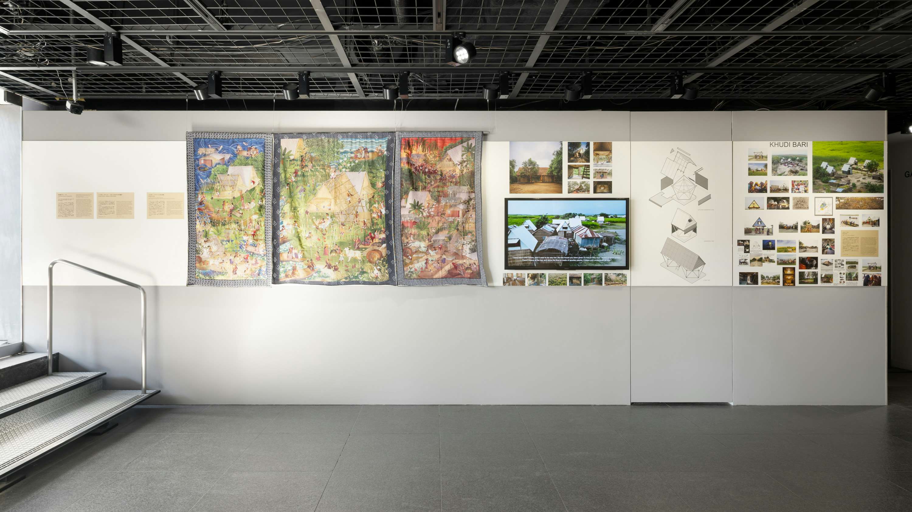 タバサムは国立新美術館で開催されたトークにおける素材についての質疑応答のなかで、まず「その土地へ行くこと」の重要性を語っている。クディ・バリが建設されている地域の多くは地図上では把握できず、そこで何が起きて何が必要とされているのか、どのような素材が適しているのかは、実際に現地に足を運ばなければわからなかったという。今日において建築は、環境に対抗する強さや美的・造形的な力を誇示するものではなく、変化を前提とした構えを取り続けることが強く求められている。「人々のために何ができるのか」という問いを真正面から引き受け、地域素材と光の扱いによって極めてシンプルなかたちへと結晶させるタバサムの建築は、人々が生を持続させる条件を整える営みとしてのレジリエンスの力を、確かに示している。なお、ベンガルのスクロール画「パトチトラ」と伝統的な刺繍技法「カンタ」から着想を得て、アリンジョイ・センとベンガルのNGO「SHE Kantha」の女性カンタ職人の共同作業によって生み出された《ベンガリ・ソング》(2023)という3連のタペストリーが、そのレジリエンスの力を象徴的に表現している。