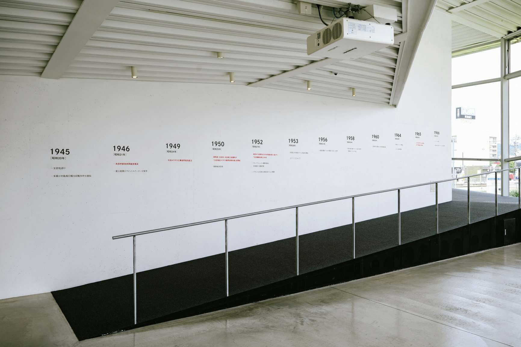 続いて2階の展示室へと向かうため、壁に沿ってゆるくカーブしたスロープをあがる。壁には年表が記されており、太田におけるメリヤスの歴史や、社会的な出来事が書いてある。ただ、社会的なトピックにはところどころ偏った話題が記載されているようにも思え、若干の違和感を覚える(他のスポーツにはほぼ言及がないのにサッカー関連の話題がある、ポール・ニザン『アデン・アラビア』が文庫化したニュースが載っている、など。これは「冒険」のパートで種明かしがある)。また、年表には、手書きで紋子、文美、紗季という3人の女性の個人史も記載されている。