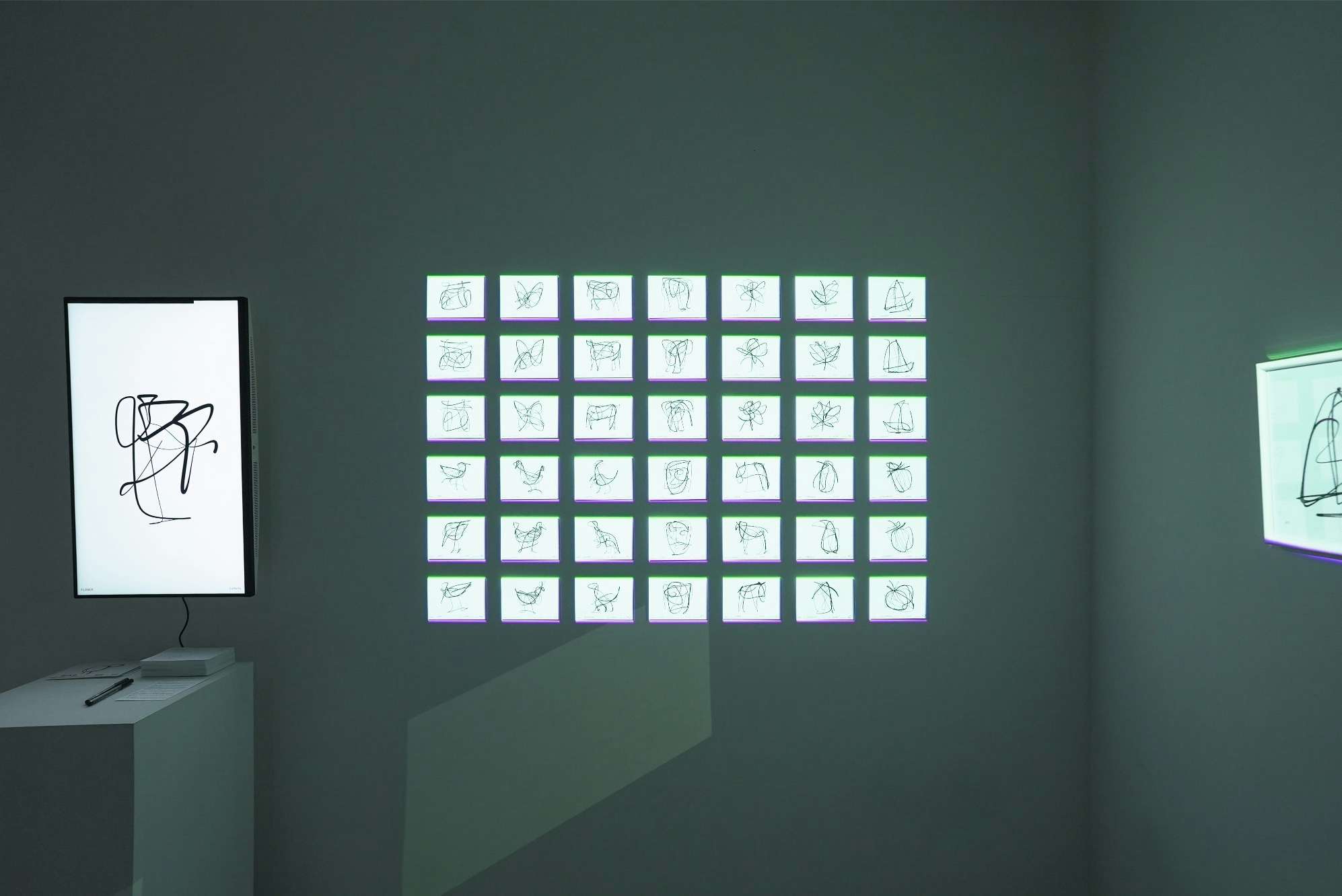 マット・デスロリエ(Matt DesLauriers)による《Latent Dispatch》は、機械の精密なドローイングと、人間の自由な発想からうまれる落描きとが交差する作品である。プロンプトをもとに機械学習システムは、膨大なデータから導かれた平均的な形へと収束する1本の線を描く。いっぽうで、鑑賞者がその場で残す即興的な落書きや線は、予測不可能で多様な表情をもつ。両者が並置されることで、規則性を追求する機械と、変化を生み出し続ける人間とのあいだに生じる緊張関係が浮かびあがる。 本作は、アルゴリズムが知覚や文化を形づくり、その出力を再び学習することで世界を均質化してしまう循環構造への批評でもあった。