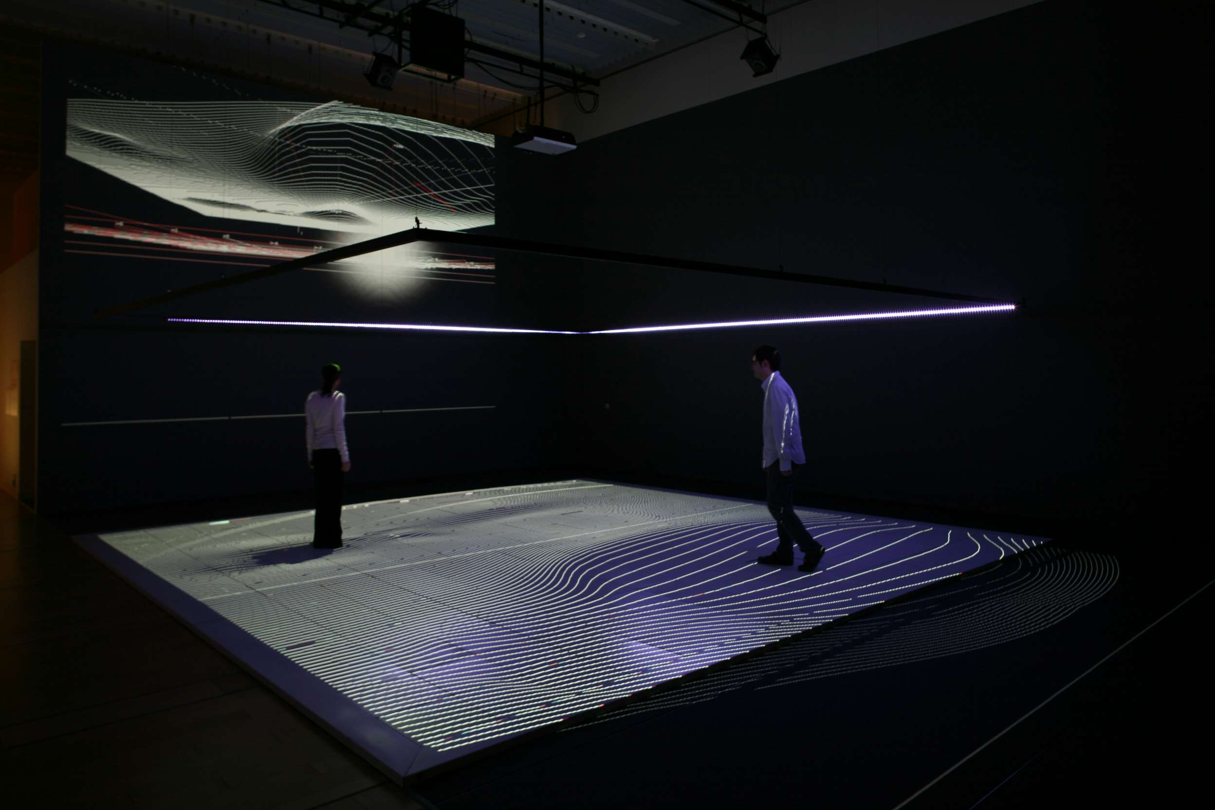 1990年代以降に展開された一連の三上のインタラクティブな作品は、人が外界と結びつく際に立ち上がる感覚の働きそのものを問い返す試みだった。身体の感覚を分断し、それぞれが身体に及ぼす作用を検証していくというアプローチ、あるいはメディア・テクノロジーを、従来は感知され得なかった領域を立ち上げるための感覚的インターフェイスとして位置づける視点は、三上の制作姿勢の根幹を成している。視覚や聴覚といった比較的明確な感覚から出発し、人間の知覚を段階的に分化させながら接近していくこと、そしてそのための手段としてインタラクションを用いるという考え方は三上独自の関心を形づくっていると言える。「知覚のインターフェイス」をテーマとした三上の作品のなかで最初に発表されたのは、視覚に焦点を当てた《モレキュラー インフォマティクスー視線のモルフォジー》(1996)、それに続く本展でも無響室で体験ができる聴覚と体内音に焦点を当てた《存在、皮膜、分断された身体》(1997)は、こうした身体の知覚をめぐる試みの一連の作品である。また、《gravicells―重力と抵抗》においては、重力を平衡感覚や運動感覚としてではなく「重力覚」として扱う姿勢も、このアプローチの延長線上に位置づけられると考えられる。