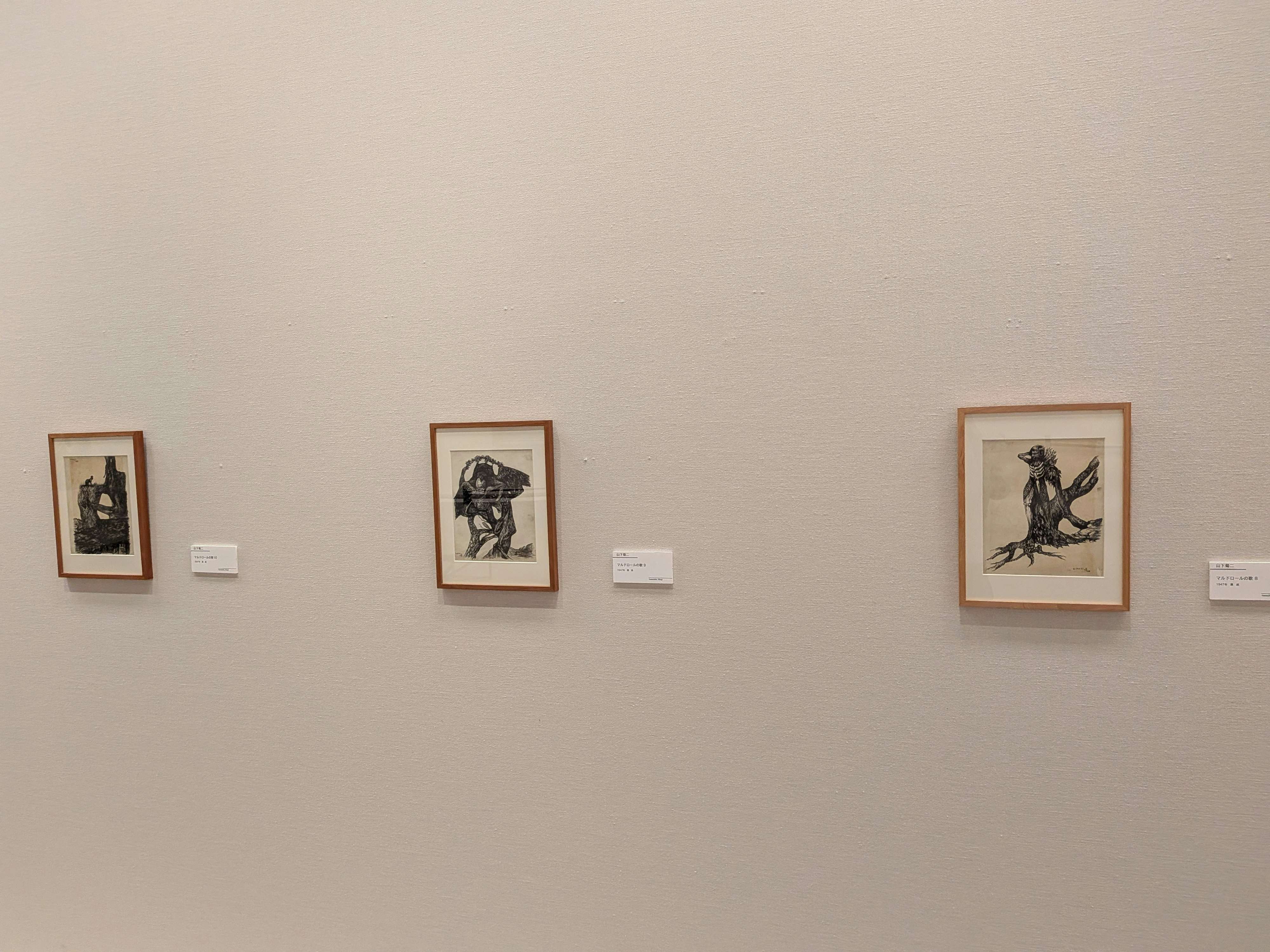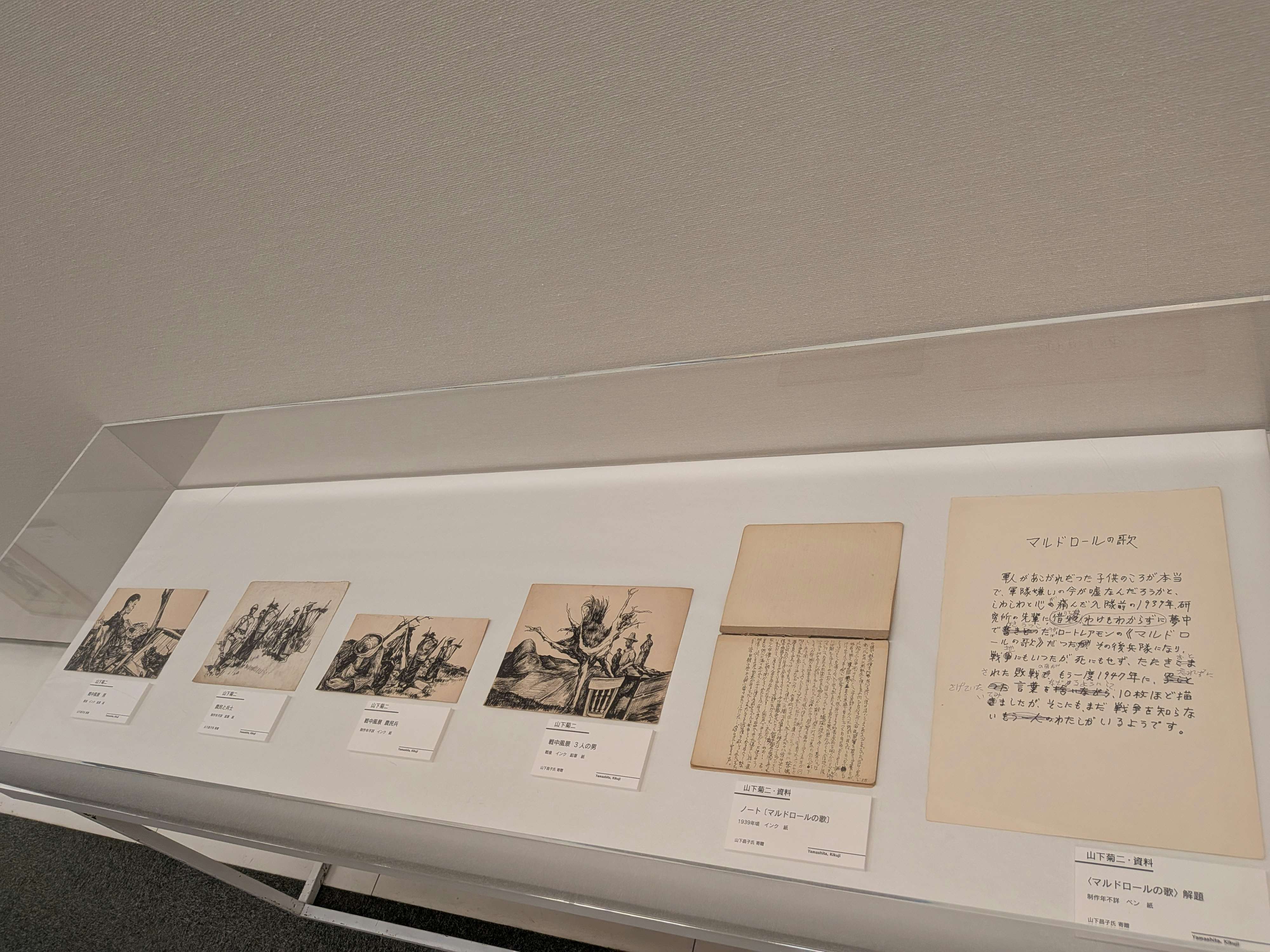 詩が呼び起こす感覚や衝動を幻想的に視覚化したダリの《マルドロールの歌》は、軽妙洒脱な線を特徴とするのに対し、山下の作品では粘り気のある描線による、執拗な描写が生々しい。ロートレアモンの詩を触媒として、戦時の体験を筆致に重ねたことは、傍に置かれた山下の直筆原稿「〈マルドロールの歌〉解題」の言葉にも滲む。