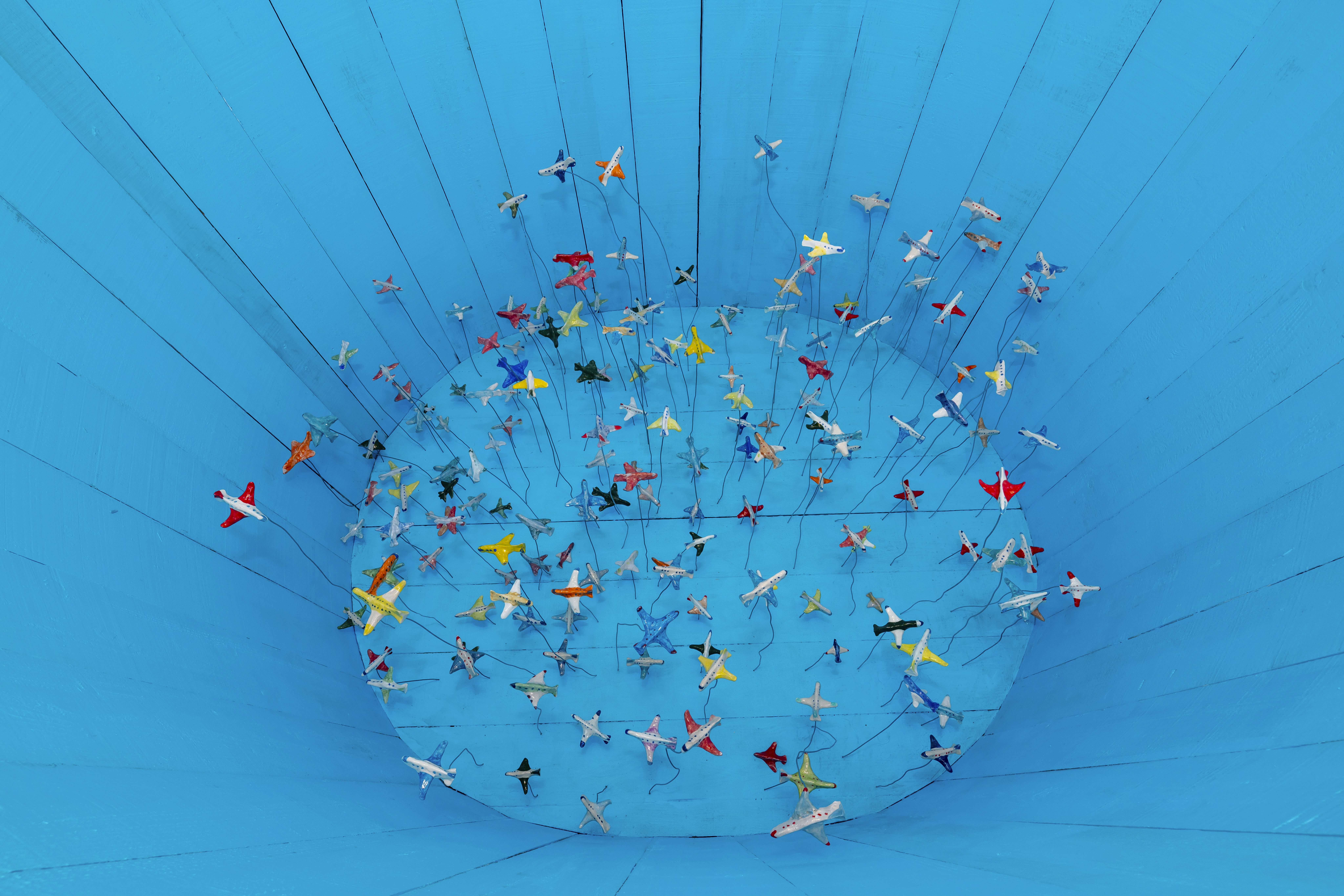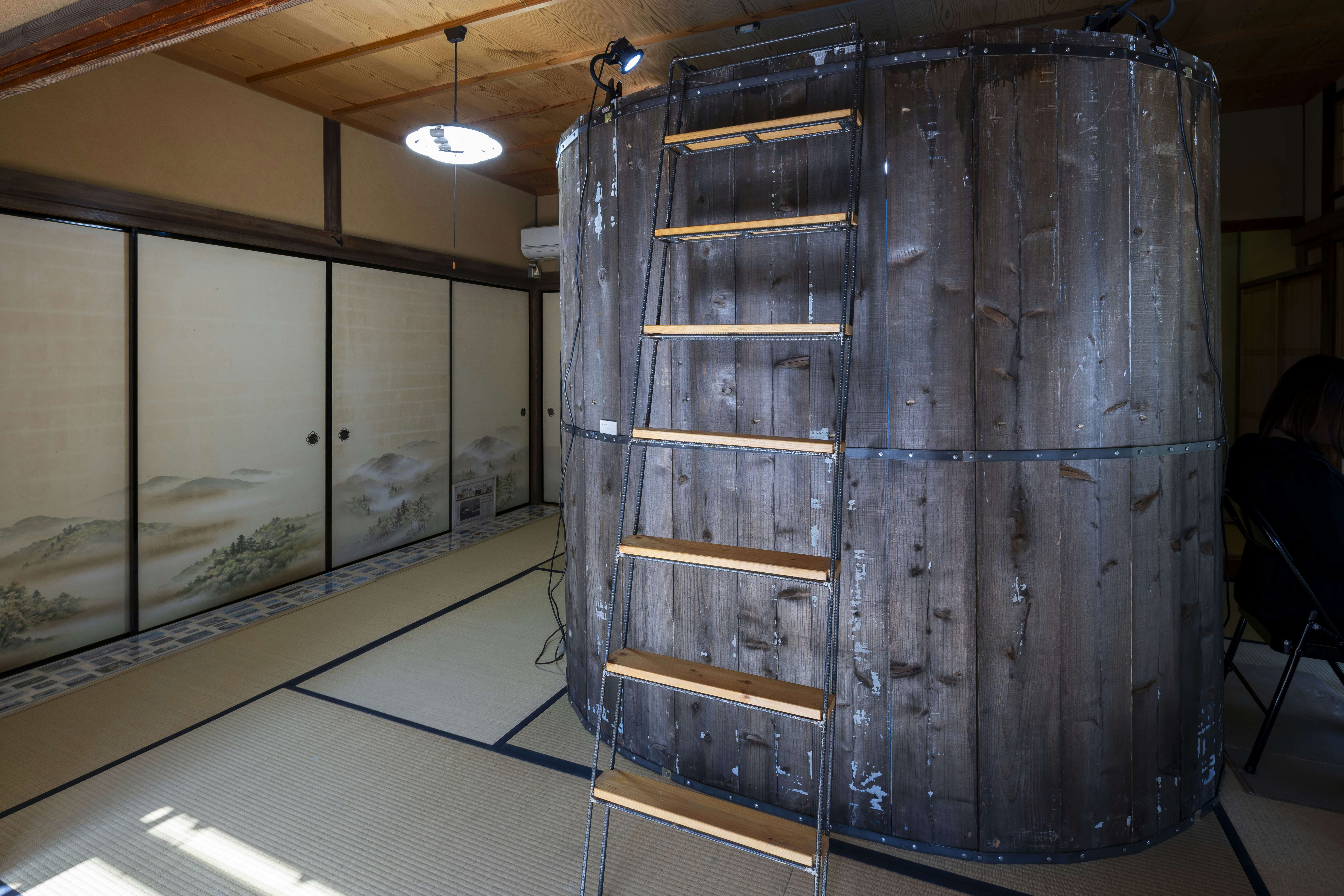 知覚の「ズレ」はアーティスト・渡辺英司が手がける風景の異化を通じて多様に展開する。生垣に自生するかのように配された小さな飛行機たちの群れに導かれ、次なる会場へと向かう。数寄屋風の瀟洒(しょうしゃ)な造りの屋内で一際目を引くのは、天井に達しそうなほどに巨大な樽だ。梯子を登り、そのなかを覗き込むと、空色に塗られた樽の内部にたくさんの飛行機が閉じ込められた光景が広がる。作家が20年前に見た夢(*3)を起点とする《空の夢》(2024)は、輸送手段である「飛行機」を貯蔵のための「樽」に閉じ込めるという、機能とスケールの倒錯が見て取れる。