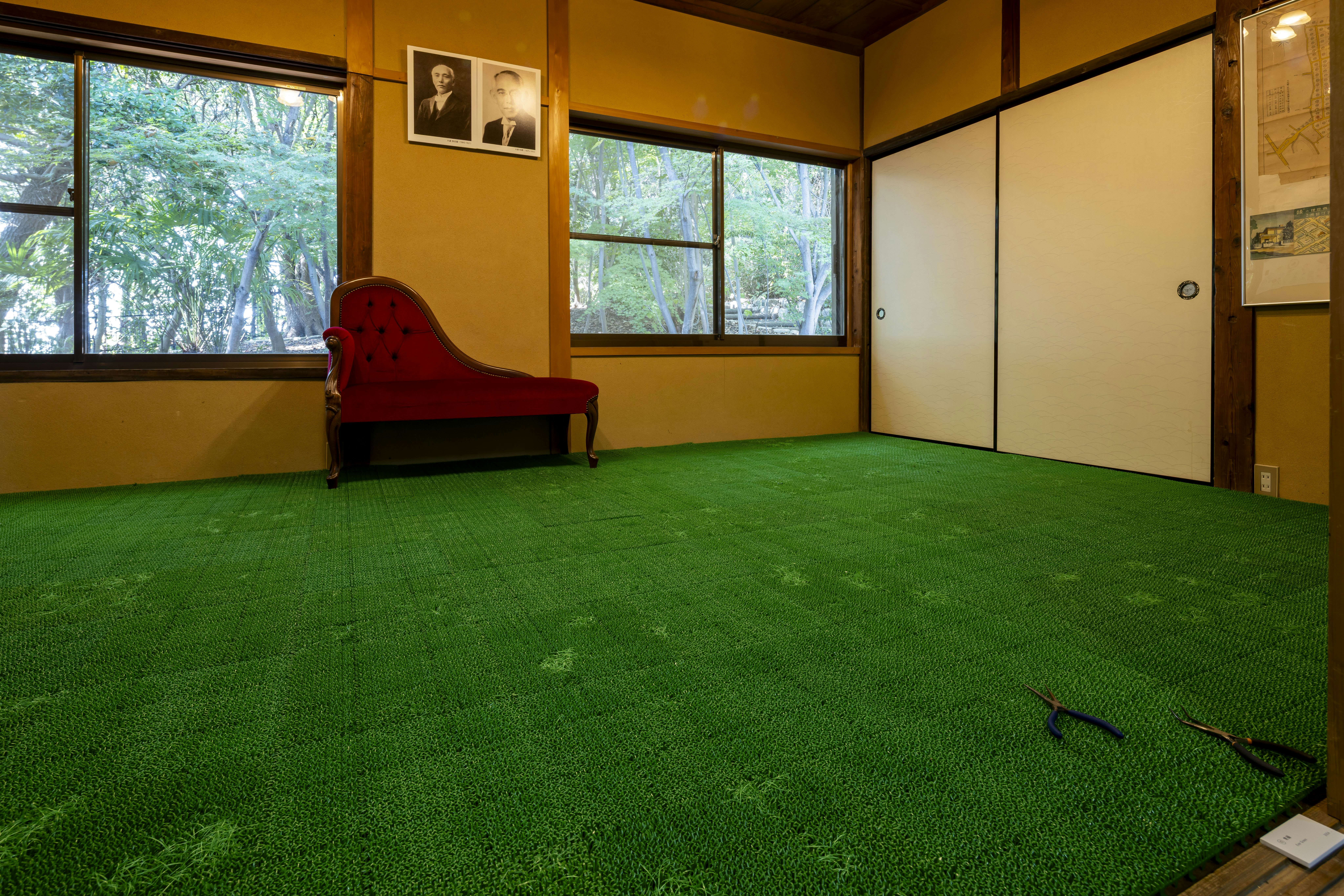 空をも見下ろす俯瞰した視点とは対照的に、床一面に人工芝が敷き詰められた空間では、来場者が床に這いつくばって芝を生育させる《常緑》(2004)が待っている。ペンチで人工芝を引き伸ばすことで、不揃いな「雑草」をつくり出していく。根本を掴み、ゆっくりと上に引っ張ることでビニール製の草が伸びる(途中で切れてしまったりもする)。手入れによって雑草が繁茂していくという、本来の庭仕事とは真逆のプロセスを経て、人工物はかえって「自然な」気配を帯びていく。どこか「噛み合わない」ユーモアに満ちた作品群は、心地よい違和感を伴いながら、見慣れた物事を捉え直す眼差しを与えてくれる。