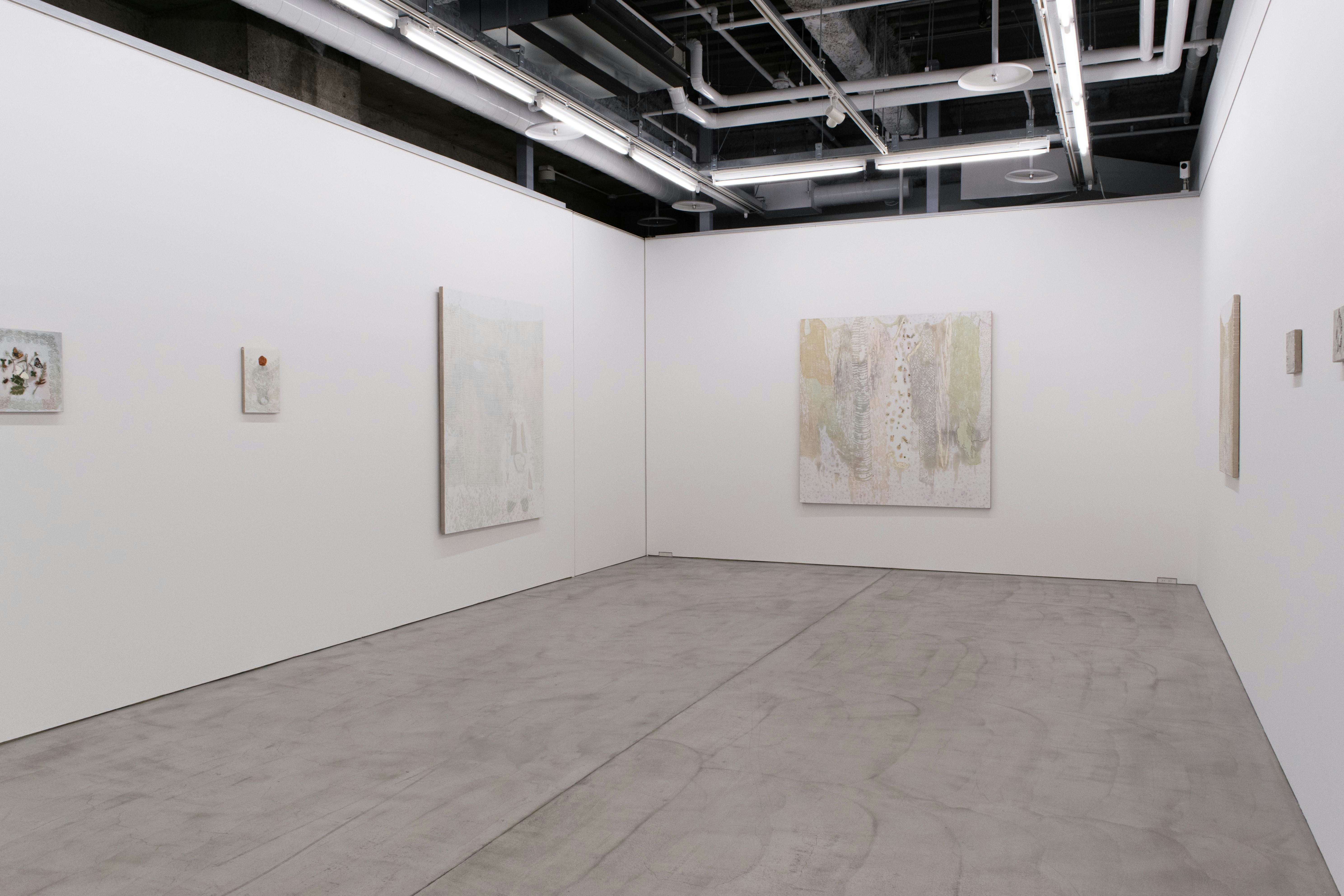 手塚は、絵画の制作過程で通常は塗りつぶされて消えてしまう下絵や下地層など、本来「見えなくなってしまうもの」の可視化をテーマとしている。その画面は、膠(にかわ)絵具で描かれた画面を下地材で一度まっさらに均し、その上から再び油彩を重ねる工程を経てつくり出される。下地層の白を基調とする手塚の絵画は、展示空間の白い壁面に溶け込むように朧げに存在しながら、その重層的なイメージを静かに主張していた。