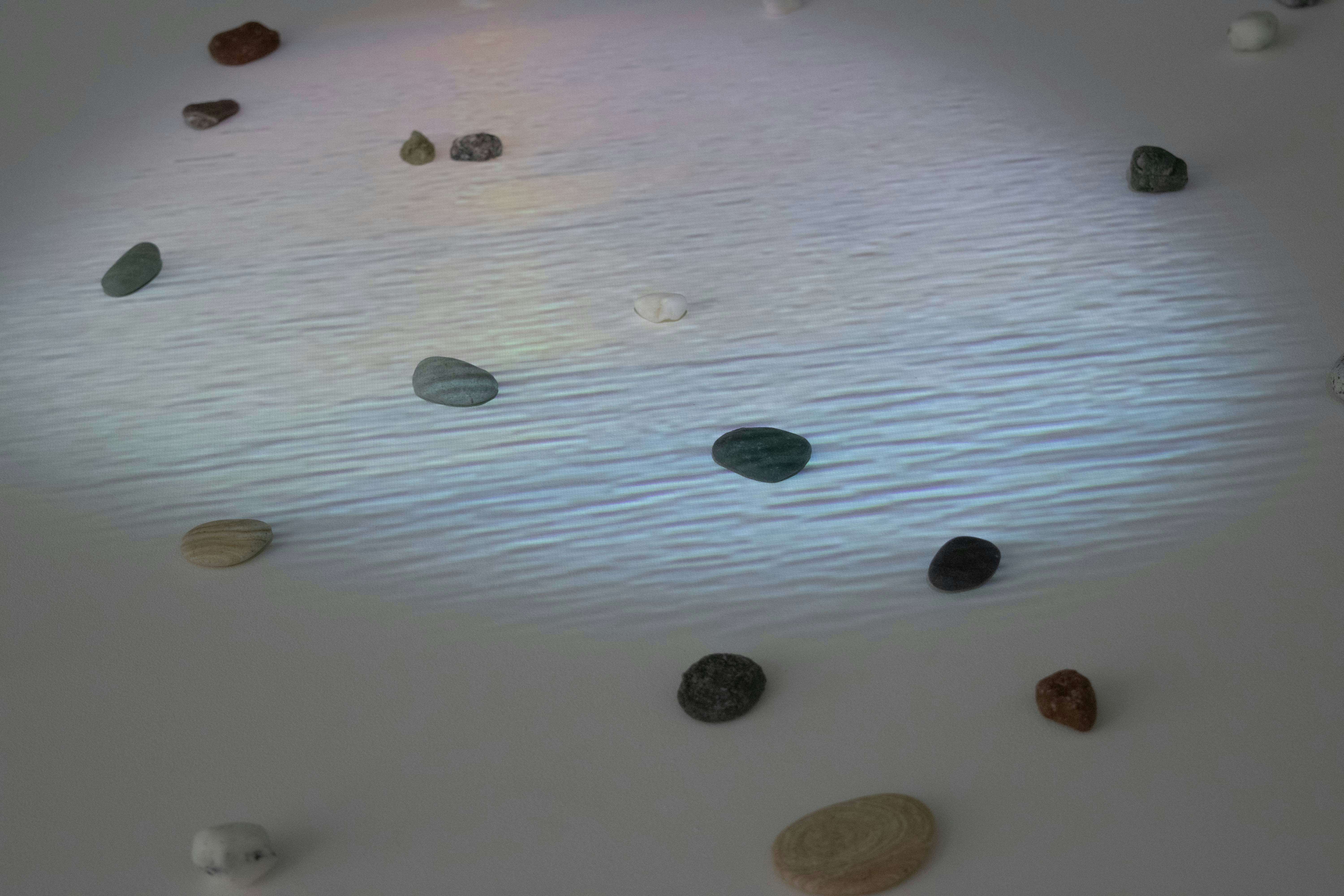 こうした「線引き」への関心は、触覚的な試みにも及んでいる。机の上に多数の小石が並べられた《生活の模倣(ものまね)》(2025)では、石鹸に彩色を施した「にせものの石」がいくつか混じっている。これらを識別する手立ては、実際に手に取った時の重さや肌触り、あるいは「水で濯ぐこと(溶けるか否か)」だ。天井から投影されたさざなみの映像は、この「濯ぐ」という行為を視覚的に示唆し、たとえ「表面」が似通っていても、事物の「内実」が決定的に異なることを提示していた。