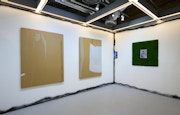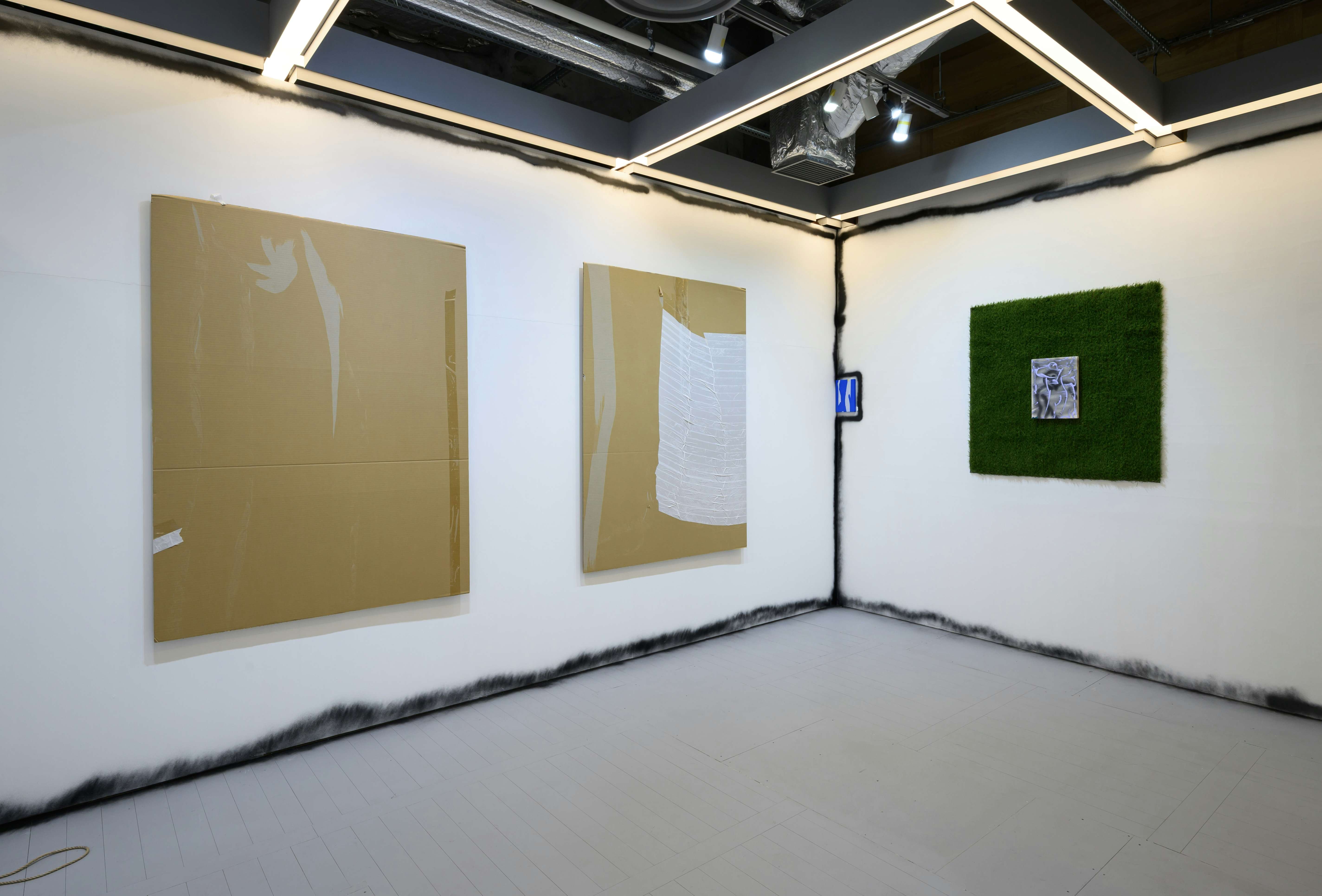 さらに須田の作品において重要なのは、通常は背景化されがちな素材(段ボール、綿布、廃材など)を、たんなる支持体ではなく作品の一部として扱い、前景化していることだ。例えば、この展示のなかでも白眉である段ボールの作品は、テープの剥がされた跡やテープのしわが絵画におけるいわゆる描線の役割を果たしている。そのテープを貼ったり剥がしたりといった身体的な行為の痕跡を段ボールに見出し、作品化している点で須田のメディウムへの眼差しの独特さが垣間見える。