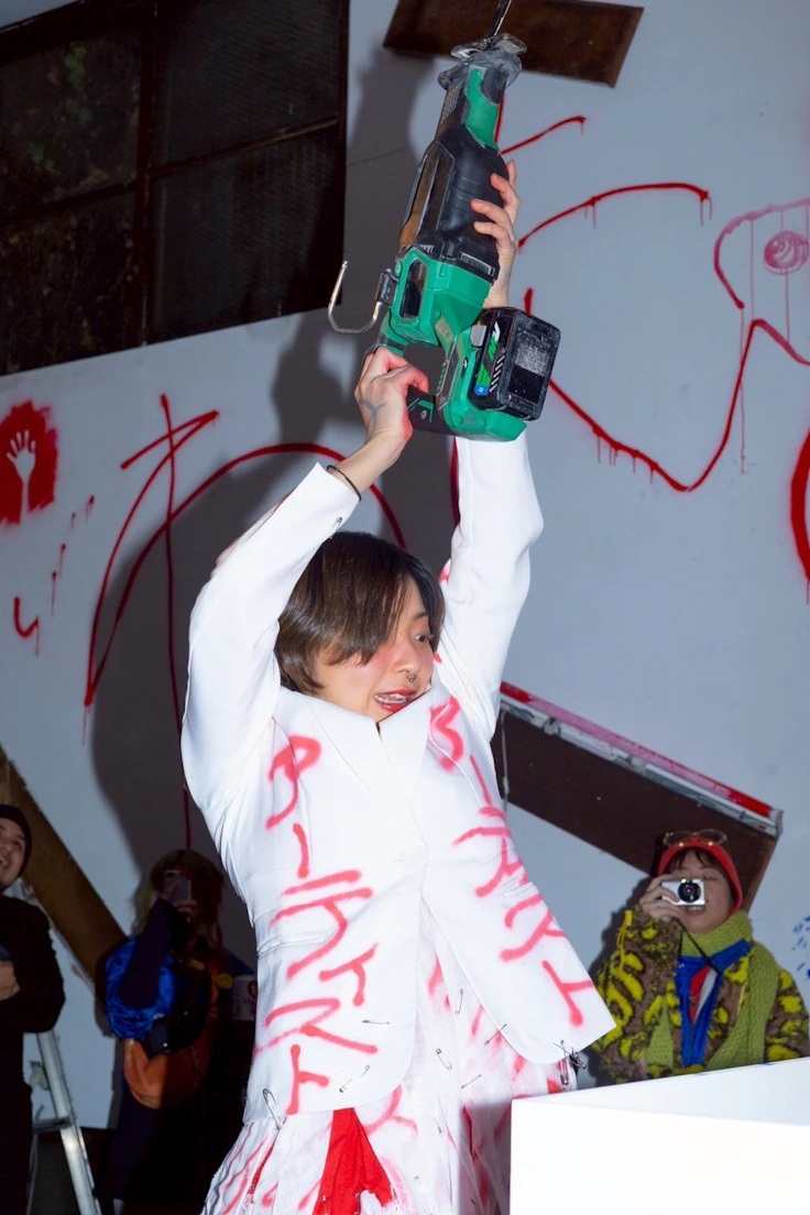 ライブハウスやクラブを主戦場とする表現者の存在や、それによって形成される客層は、「牢」の受容空間の性格を大幅に規定する。パフォーマーは、鑑賞者から切り離された距離のある作品として静かにまなざされることを許されず、見るだけではなく動きもするものたちからなる沸騰する場の中心を担う何かへと変貌してゆく(*10)。前2回の会場が幡ヶ谷のFORESTLIMITというクラブ/ライブハウスであったのは、そもそもこうした受容空間をつくり出すことそれ自体が芳賀の狙いであったことの証左と見てよいだろう。そうした表現者が引き続き参加していたことに加え、これまでの「牢」の積み重ねによって形成された客層が会場を埋めたことで、現代アートとの親和性が高い空間であるWHITEHOUSEを舞台とする「『牢』vol.3」においても、同様の受容空間は一定以上に維持されていた。パフォーマーへの歓声や野次が飛び交う事態が散見されたことからもそれは明確である。