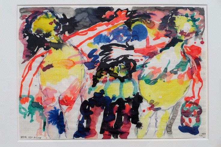 いま画期的と書いたが、むろん、年代を遡りながら、最初期の素描や個展案内まで周到、かつ執拗に並べて見せた点で、同時にこれは日本におけるひとつのまとまった回顧の機会ということができる(それだけに、作品を網羅した図録が発行されないのが残念で仕方がない)。けれども、本展がそこに留まらないのは、これまで日本ではほとんど見る機会のなかった膨大な数のパワフル、カラフル、そしてワイルド極まりないドローイングが壁面をところ狭しと埋め尽くす様で、これはもう圧巻というしかない。みずからの病身はもとより、介護中の母、そして鶏や豚といった家畜にまで拡張された折元のパフォーマンスの根底に、このような描画への衝動が横たわっていることを思い知らされる。裏返してみれば、彼のパフォーマンスが構図や色彩の点で、もともと絵画的要素を持っていたことにもなるだろう。そこにはつねに、個体としての「自分」を包む表皮を突き破って、本来なら無縁なはずの他者や物質とどんどん交わり、繋がっていこうとする、不気味と呼びたくなるほどの生命力の横溢がある。