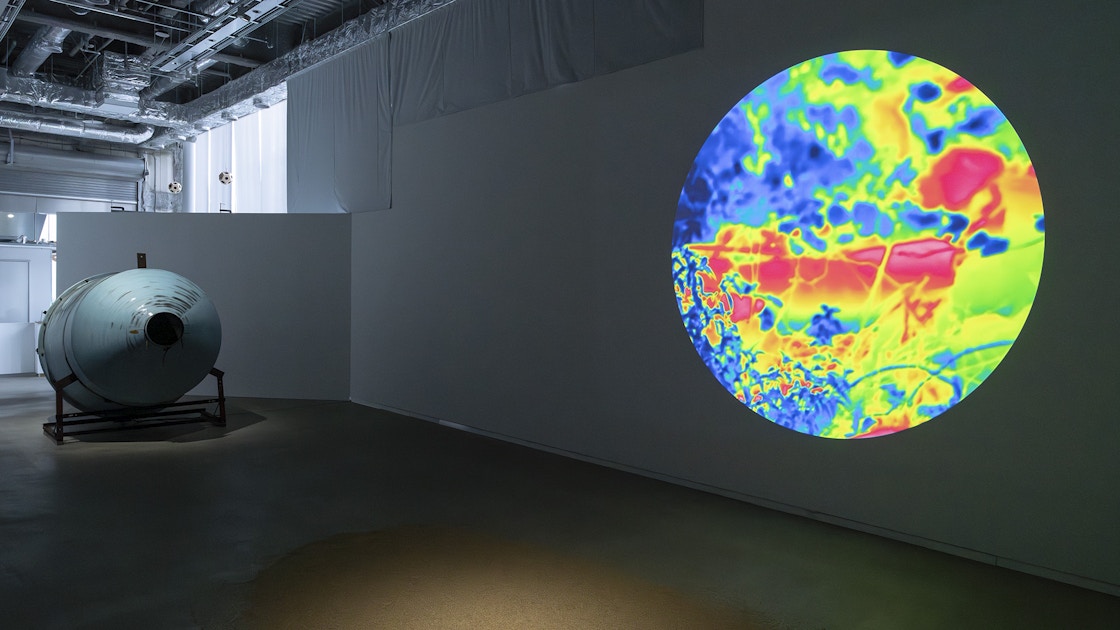 また、展示空間の向かって左側には、サーマルカメラによって養豚場と豚たちをとらえた映像が円形に投影されている。人権宣言が朗読されるときには熱反応のない冷たい青によって廃墟となった養豚場が映し出され、豚たちの物語のときには白、赤、橙、黄、緑、水色、青のグラデーションによって豚たちの姿が映し出される。ここで示唆的なのは、この対比構造以上に、赤外線の熱反応によって世界を視覚的に表象しようとするサーモグラフィーの歴史的な次元であろう。サーモグラフィーの技術発展において軍事やセキュリティとの関係は重要なものである。それは熱を可視化することによって「排除」すべき生体を索敵し判別するための視覚の技法として発展してきたのだ。サーモグラフィーは軍事利用以外にも、夜間や見通しの悪い森のなかで狩猟や害獣駆除を行う際にも活用される。サーモグラフィー市場の大手、フリアーシステムズのウェブサイトには以下のように書かれている。