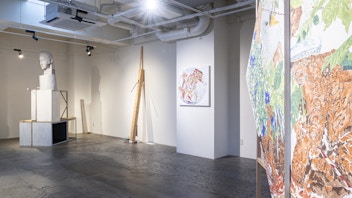現代の生命科学論的な思索にもとづき、コンピュータ・シミュレーションによって生まれる自己組織的なプロセスやパターンを作品のモチーフとする村山悟郎。本展では代表作の織物絵画を展開させ、たんぱく質のフォールディングにおける、3次元構造が折りたたまれる生成過程を参照した新作を発表した。キュレーターの四方幸子が新たな展開を中心に読み解く。
