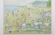 グランド・ジャッド、まだ描かないの? 様子を見に来た関さんが言う。マスキングテープが貼られている。背景部分をある程度仕上げてから、模写部分に取りかかりたかったが、このスタジオを公開しなくてはいけない意向もあり、仕方なくグランド・ジャッド島の日曜の午後を描くことにする。