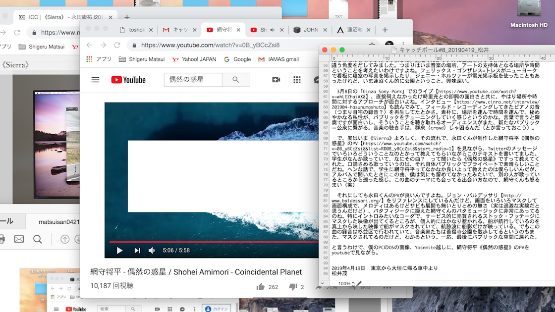 で、じつはいま《Sierra》よろしく、その流れで、永田くんが制作した網守将平「偶然の惑星」のPVを見ながら、Twitterのメッセージでいろいろどういうことなのとか、永田くんに教えてもらいながらテキストを書いてました。「偶然の惑星」は、僕の学生が研究室きてなんか歌ってるから、「なにその曲?」って聞いたら教えてくれた。口誦さめる歌っていうのは、それ自体パブリックでプライベートを獲得している気がする。素晴らしいことだね。で、じつは学生には「網守将平ってなかなか良いよ」って教えたの僕らしいんだが、アルバムで聴いたときに、この曲、僕は気にも留めてなかったみたいで、学生経由だった。こういう出会い方、この曲のテーマにも合ってるので、網守くんも怒るまい(笑)。