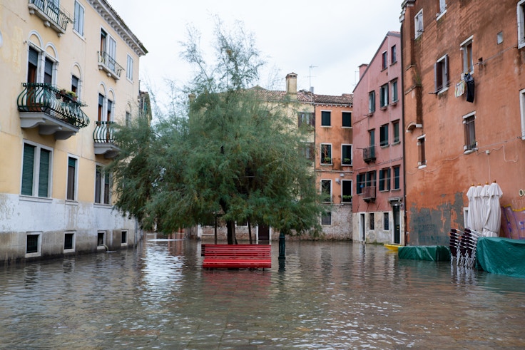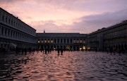 ヴェネチアという海に囲まれた、しかもそのときは水没していた場所にいるのに、周りは濁った水ばかりで海を見逃している気分だった。開けた海を見たくなり、私は船でリド島に向かった。映画『ベニスに死す』(1971)の舞台にもなったビーチがある。しかし季節は冬、ビーチはすでに閉鎖されていて、フェンスの向こうに寒空の下コテージが並んでいた。海にたどり着けないまま、ヴェネチア本島に戻る。潮位が下がり入れるようになった夕暮れ時のサンマルコ広場は空も水面も鮮やかなオレンジで、突如街が色を持ちはじめたように感じる。