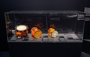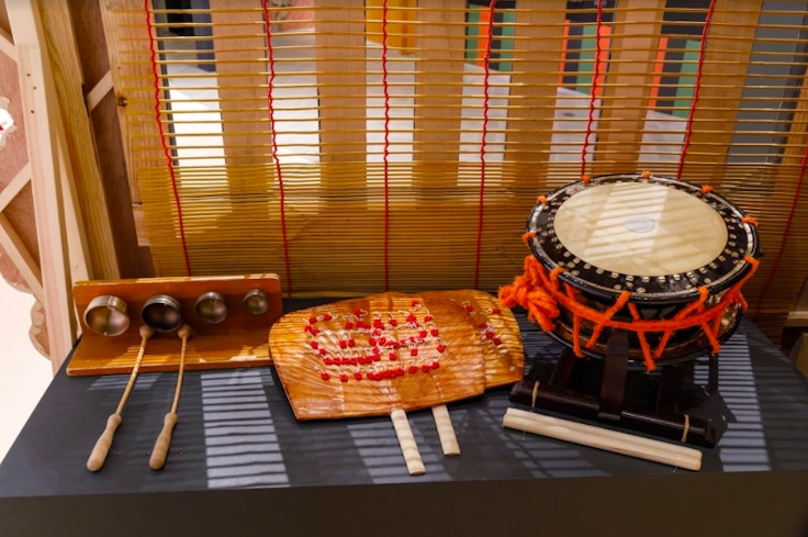 第5章は「雅楽」は、西国の人が蛇を求め得て喜ぶ姿を舞にした『還城楽(げんじょうらく)』をマネキンで再現。正式な舞楽で用いられる高さ5メートルの巨大な「鼉太鼓(だだいこ)」を設置する。