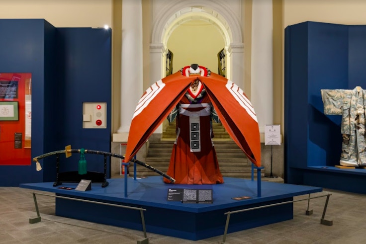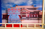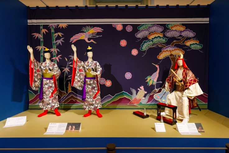 第3章は「能楽」。能面と縫箔(ぬいはく)の豪華な装束に、長絹と初冠を着けた姿を、世阿弥の能を代表する『井筒』の舞台で表現。自然を写す草花の模様を取り入れたデザインを見ることができる。第4章は琉球王朝の音楽劇「組踊」を取り上げる。首里城正殿の御庭に設置された、御冠船芸能の舞台を再現するとともに、沖縄の故事にある天人女房譚に取材した組踊『銘苅子(めかるしー)』の天女を立体的に展示する。
