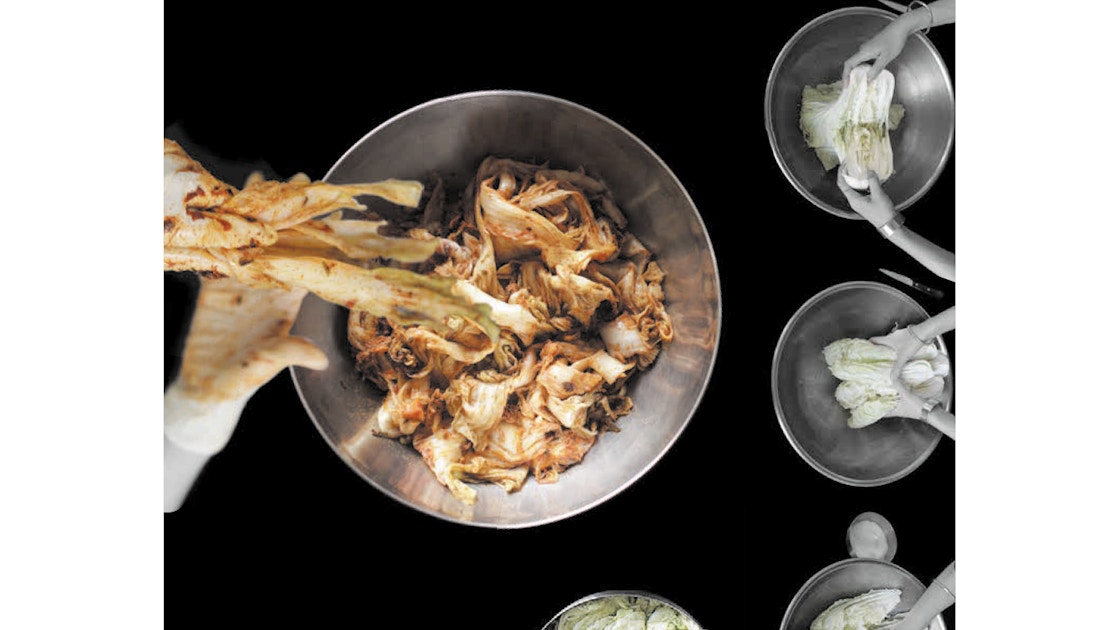 ペーストの3分の1量を大根とネギのボウルに入れる。ゴム手袋をはめた手でペーストを野菜とかき混ぜたりもんだりして、ペーストを完全に行き渡らせ、野菜を均等にコーティングする。別の3分の1量のペーストを、さっきの塩と同様に1枚1枚のキャベツの葉に塗る。この場合も根元の部分にはペーストを多く、柔らかい葉先の部分には少し使うようにする。キャベツの葉がすべてコーティングされたら、大根の入ったボウルの中身を同じ要領でキャベツの葉の間に詰め込む。残ったペーストは別に使うために取っておく。辛くてスパイシーなキムチが好みなら、手順ごとにペーストの3分の1量ではなく半量を使うか、好みに応じてレシピを調整してほしい。