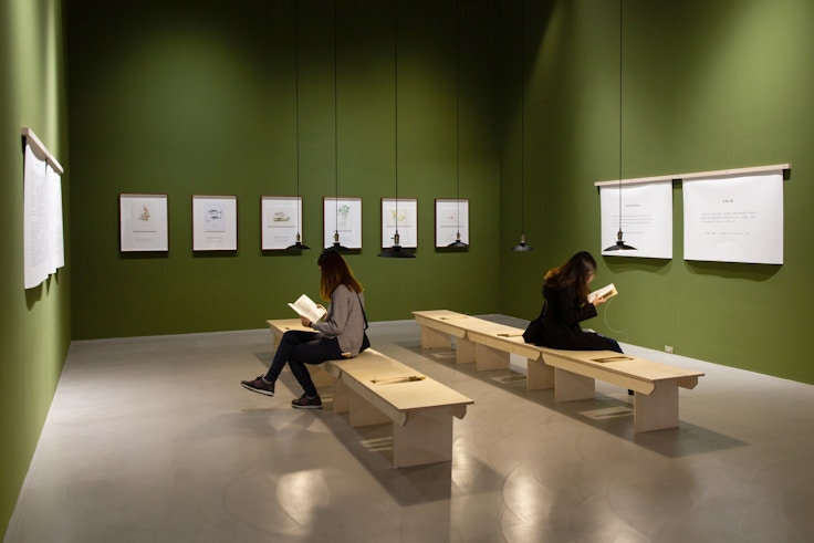 例えば2018年の台北ビエンナーレに参加した呉明益(ウー・ミンイー)は、日本でも翻訳が出版されている小説家だ。1941年の旧日本軍によるマレー半島侵略や、戦争に翻弄されて最後に台湾にたどり着いたアジアゾウのエピソードを背景にした『自転車泥棒』(天野健太郎訳、文藝春秋、2018)は、イギリスの国際的な出版賞であるブッカー国際賞にノミネートされた。台湾の持つ複雑な歴史の層が作品に織り込まれるのは許家維や王虹凱の作品にも通じ、自身でイラストレーションも手掛ける呉が出品したのは、小説の構造を利用した6枚の「挿絵」であった。