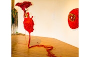 1つ目は赤色の作品《生命軸》。心臓や子宮といった生命のリズムを表わすモチーフを使いました。
