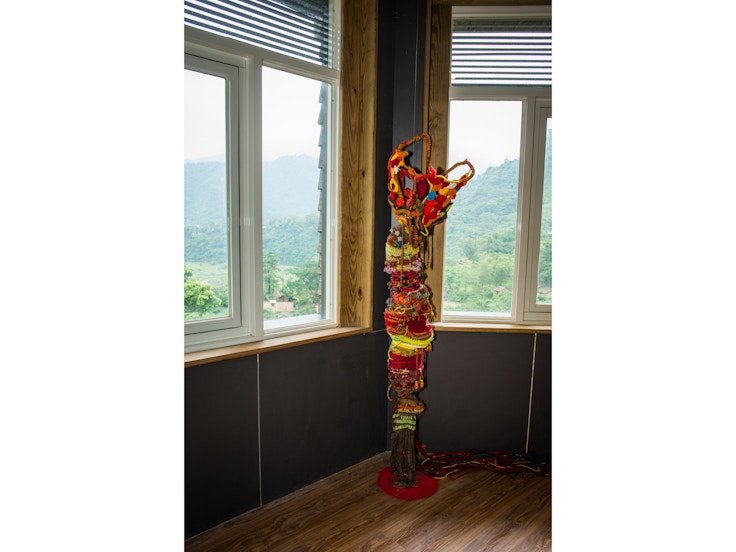 「八八水害で大きな被害を受けた私たちの集落は、新しい場所に引っ越しを余儀なくされ、精神的に大きな変化を経験しました。以前は私も集落を出て仕事をしていたのですが、古い土地を失ったことで改めて集落の伝統や以前の山の上での暮らしを支えてくれた大自然との関係について見つめ直し、集落をベースに創作を始めました」。