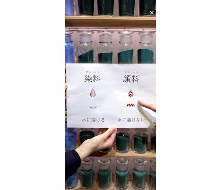 多くの視聴者が最初に称賛のコメントを寄せたのは、洗練された館内の設え。建築家の隈研吾が手掛けた内装は、壁一面に色鮮やかな約4500色の顔料の瓶が並ぶ。すべての顔料が量り売りで購入できるそうで、絵画を制作するひとだけでなく、プラモデル製作者、デザイナーなど色を仕事にするひとなども顧客となっているそうだ。