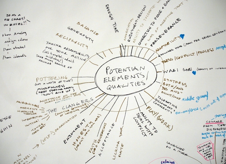 この作品の発端は、自身が参加した気候変動対策キャンプ(地球環境への意識を高めるための集会)だった。世界の金融システム、地球の気候変動史、英国のEU離脱(ブレグジット)への道、民主主義に対するテクノロジーの影響など、人間社会を形成する経済的、歴史的、地理的、生物学的プロセスや構造を理解するために図式化されたものだ。
