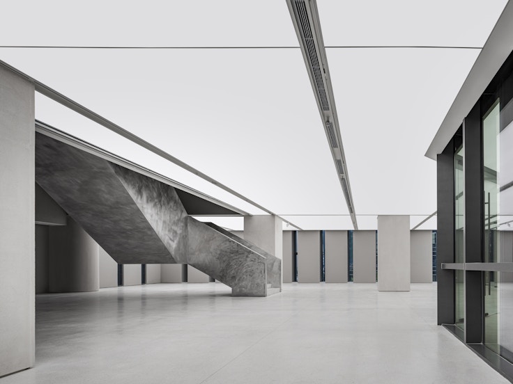 UCCAのパートナー企業のひとつである「K. Wah International Holdings Limited」が所有するビル「盈凱文創広場」(EDGE)は、四角く平たい箱を積み重ねたようなたたずまいが、どこかニューヨークのニュー・ミュージアムをほうふつとさせる。UCCA Edgeを担当した建築家ユニット「SO – IL」(ジン・リウ&フロリアン・アイデンバーグ)のアイデンバーグのほうが、かつて働いていたSANAAでニュー・ミュージアムを担当していたのは偶然だが(建物自体は別の建築事務所によるもの)、街の中に新しくできるアートセンターとして近しい存在感を持つことになったというのはあるかもしれない。グランドフロアに置かれたエルヴィン・ヴルムの《UFO》(2006)を横目で見ながらエスカレーターに乗ると、2階のレセプションデスクへと導かれる。その階から4階までの、5500平米の空間がUCCA Edgeだ。