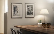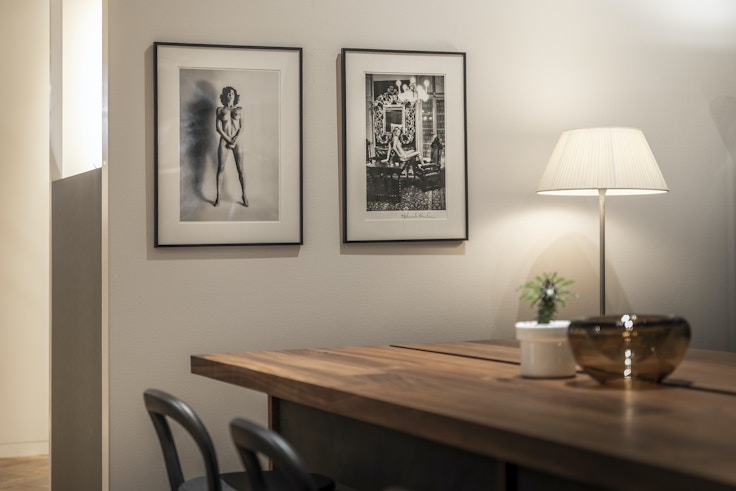 計算されつくした世界観を打ち出すニュートンの作品と対照的に紹介されているのはテイラーの作品。19歳のバスキアと出会った15分後に互いを撮影し合ったポートレートは瞬間の熱量やライブ感にあふれている。好対照な二人の作家のモノクロ写真が、アルフレックス玉川のインテリア空間をスタイリッシュに演出する。