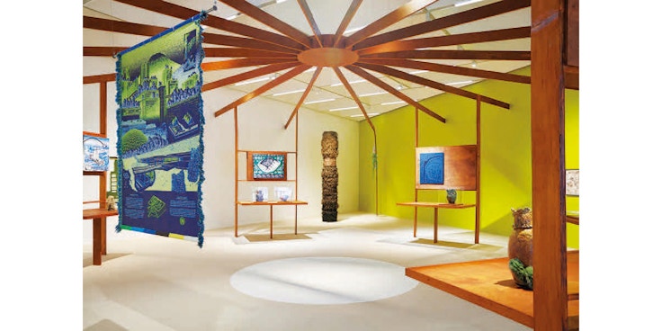 展示は4つの部屋=時空に分かれ、「変化の時」では、19世紀の地図や都市計画地図などノッティンガムの地図から始まり、地球崩壊の時に備えて自宅で土を「栽培」する方法を動画にしたアサッド・ラザ、グレース・ンディリトゥによる未来に開発される紫外線を完全に防ぐ日焼け止めの広告映像など、災害などにより変化する日常や感覚を想像させる。「理解する時」では、大洪水の災害から復興し、ノッティンガムに繊維産業が復活、職人たちは周囲の自然に色彩的に調和できる新たな色染技術を生み出すという設定。古代エジプトで臓器を保存するために使われていたカノプス壺の頭、ボーンチャイナによるほのかな青色をした馬の骨粉で描いたコーエン・ヴァン・バーレンの平面作品など、文化的人工物や映像が点在する。「内なる知のための時」を主導したグレース・ンディリトゥは、遠い祖先が信仰してきた知を集結させ、対話や体験を通した癒やしの空間として《テンプル》と題した放射状の構造物を設置。そこに刺繍、織物、陶器、平面作品などが並び、くつろいだ空間が現出した。「知恵を伝える時」でフェムケ・ヘレグラヴェンは、暮らしに大きな影響を与える気候変動に順応するために、自然のシグナルをとらえる手法を探り、様々なオブジェや記号を暗号のように配置する。