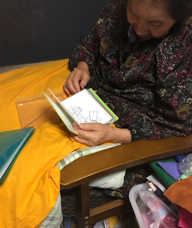 1987年に生まれた志賀さんは、両親が共働きだったため、きよゑさんにご飯をつくってもらうことも多かった。いわゆる「おばあちゃん子」として育った志賀さんにとって、そのときの恩返しをするように、2012年から東京近郊や静岡、長野、熊本など全国各地で「ぼけぼー」の展示を続けている。志賀さんの両親と弟と同居をするきよゑさんにとっては、「ぼけぼー」の制作は、できあがった作品を家族で称え合うなど、家族間のコミュニケーションのひとつにもなっているようだ。当初は、作品が知れ渡ることを恥ずかしがっていたというきよゑさんだが、展覧会場で記された感想ノートをいまも大事にベッドの下に仕舞っているというから、たくさんの人の声援がいかに彼女の制作を後押ししているかが分かるだろう。