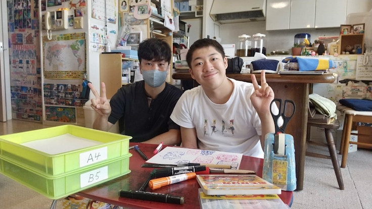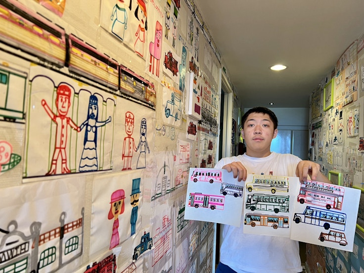 作者は、この家に住む15歳の立川幹大(たちかわ・かんた)くんで、母親が幹大くんの描いた絵を額装して飾っていたところ、10歳ごろから自分でも壁に貼り出してしまったようだ。驚いたことに、それは廊下の壁だけではなかった。自室やトイレ、リビングなど家中のほとんどの壁面が幹大くんの作品で占拠された状態になっている。「コロナ禍で中学校入学が6月に延びたときに、本人が全部剥がしたんです。丸めて捨ててしまったものもありましたけど、『これは!』というものは私が保管しておきました。『ぼくは中学生になる、ぼくは大人だよ』という意思表示だったのかなと思います」と母の菜美さんは教えてくれた。