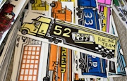 その時期から幹大くんは、乗り物や人物などの絵を描き始めた。小さい頃から工事現場のブルドーザーや貨物列車といった大型の乗り物が好きで、現在でも電車が一望できる公園にひとりで頻繁に行くことのある幹大くんは、とにかく乗り物の絵をよく描いている。不思議なことに、すべて横向きで描いているが、近年では大好きなアニメ『カーズ』の影響を受けて、運転席の窓に「目」を入れて擬人化した作品も多い。最初は線画のみだったが、1年半ほど前からマジックで彩色を始め、大型トラックの荷台には、果物や数字、番号の付いた服を着た人の姿など独自のデコレーションを施すようになった。