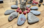 玄関先に並べられていたのは、様々な表情を浮かべた石の彫刻で、文字が刻まれたものから、大きな口を開けて何かを訴えるような顔をしたものまである。作者は、この家に住んでいた小八重政弘(こやえ・まさひろ)さんで、「住んでいた」という言葉の通り、現在は道路を挟んだ新居に家族と暮らしている。小八重さんの案内で3階の居室へお邪魔すると、梅干しのような真っ赤な造形をしたオブジェや金色に輝く大黒天、そして本物と間違えてしまう小銭入れなど、とても石を加工したとは思えないほどのクオリティの高い作品が至るところに陳列されている。