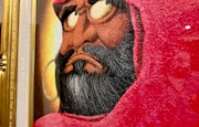 「2作目につくった『達磨』は経年劣化で色味が飛ばないか等を確かめるために、ずっと自分の部屋に飾っているんです。でも、そのあとに制作した3作目の『達磨』の存在は、すっかり忘れていました。ある日、偶然に箱の中から発見して、『こんな絵があったのか』と自分でも驚いてしまいました。絵の中の達磨が、睨みを利かせて『いつまでこんな暗い場所に置いとくんだよ』と力強く訴えてきたんです」。
