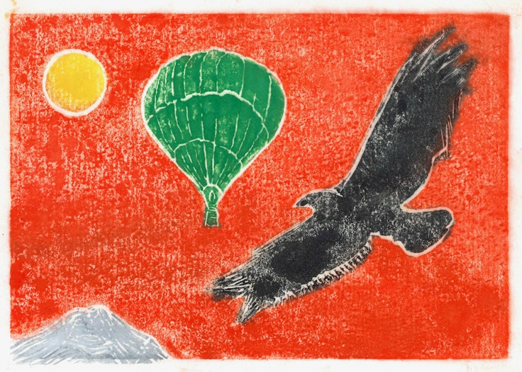 「医者からは『死を覚悟してくれ』と言われたんです。明日から腕が動かなくなるかもしれないという恐怖心のなか、リハビリを兼ねて手に持ったのが彫刻刀だったんですよね。若い頃に、ジャンピング・バルーンで空を飛んでいた頃を思い出して彫り始めたんです。でも、最初につくった版画を妻に見せたところ、『これは何』と言われ、ジャンピング・バルーンだとは思ってくれなかったんです。それがなんだか悔しくてね、そこから10年ほど集中的に彫り続けました」。