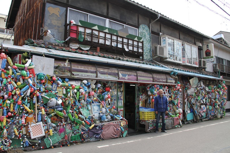 国道184号線に並行する旧道を挟んで建つ2棟の建物の、1階部分の壁を埋め尽くす大量のペットボトルやガラクタの数々。上を見上げると、サントリーのレトロな看板に「ひめじや」の屋号が書かれている。そう、ここは酒屋なのだ。道の両側がどちらも酒屋の店舗であり、それらがまるごと「ひめじや」主人の作品となっている。