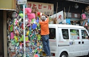 そんな山名さんの主な仕事は、配達業務。アトリエと化しているのが、配送車として店の前に駐車してある、白い軽のバンだ。その車内で、ペットボトルの蓋に穴を開けたり針金を丁寧に巻き上げたりと、山名さんは作品制作に励んでいる。中を覗くと、車のダッシュボードにまでカラフルなペットボトルの装飾が施されていた。