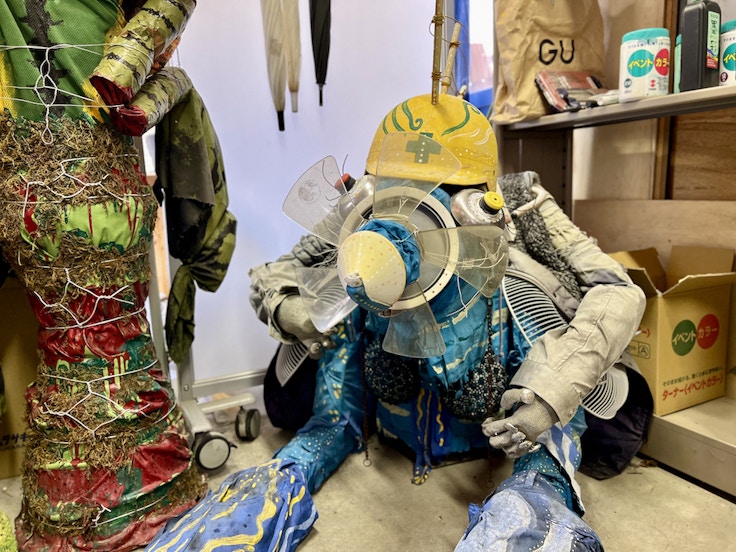 制作にあたっては、100円ショップに売っているプラスチックの植木鉢を重ねて、針金や接着剤で固体し土台を作成。その上から廃材や廃品を組み合わせて、創作していく。これまでつくった大きなオブジェは、20体以上にもなる。最初は1ヶ月に1体のペースで制作していたが、近年は細部までこだわるようになり、大幅に時間を費やすようになった。