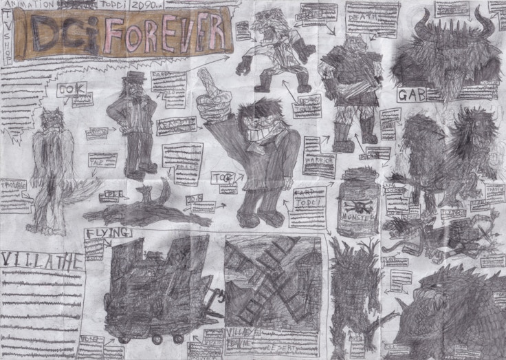 しかし、その残された作品群からは、「主人公のCOK(コック、狼のキャラ)とTOD(トッド、冬馬さんのアバターと思われる)が悪の組織Villayと戦う冒険活劇を舞台とし、物語の企画、漫画、詳細なキャラ設定、そして映画とそのフライヤーまですべてを独力で制作している」という全体像が浮かび上がってきている。作品には1980や2005という文字もあり、TODの父親または祖父と推測されるFARD(ファード)という人物も頻繁に登場することから、世代を超えた壮大な歴史物語である可能性も否めない。