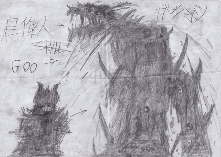 また、Nintendo SwitchやWiiなどのゲーム機を自在に使いこなすデジタルネイティブ世代である彼は、自身が没頭するゲームや映像からも多くのモチーフを得ている。その源泉は多岐にわたり、様々な国を冒険するNintendo Switch用の3Dアクションゲーム『スーパーマリオオデッセイ』は、彼に世界の国々に関する知識をもたらしている。ときに、それは現実世界の情報にも及んでいる。例えば、画中で「Gold House」の記載がある建物は、修学旅行で訪れた金閣寺をモチーフにしている。こうした情報源のうち、『ゴジラ』のような映像作品や『悪魔城ドラキュラ』といったダークな要素が、彼の世界観を構築するのに強く影響しているようだ。彼はこれらを、何も見ずに瞬時に描き出していく。