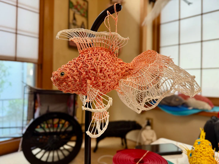 創作のプロセスは、生き物の種によって驚くほど多角的だ。鯉や金魚といった魚類では、9本取りのバンドを用いて腹の膨らみや背びれの伸びを自在に操り、「鱗崩し華編み」で本物さながらの質感を表現する。シラサギなどの鳥類になれば、首の曲線や胴体の厚みの変化、大きく広げた翼の構造を「ねじり編み」などの技法を駆使して実現していく。さらにキリンやキツネのような哺乳類では、頭部から後ろ足までを一気に編み進め、骨格に沿った流麗な曲線を再現。重力計算を見越したかのように、尻尾で絶妙にバランスを取り、作品を自立させる。