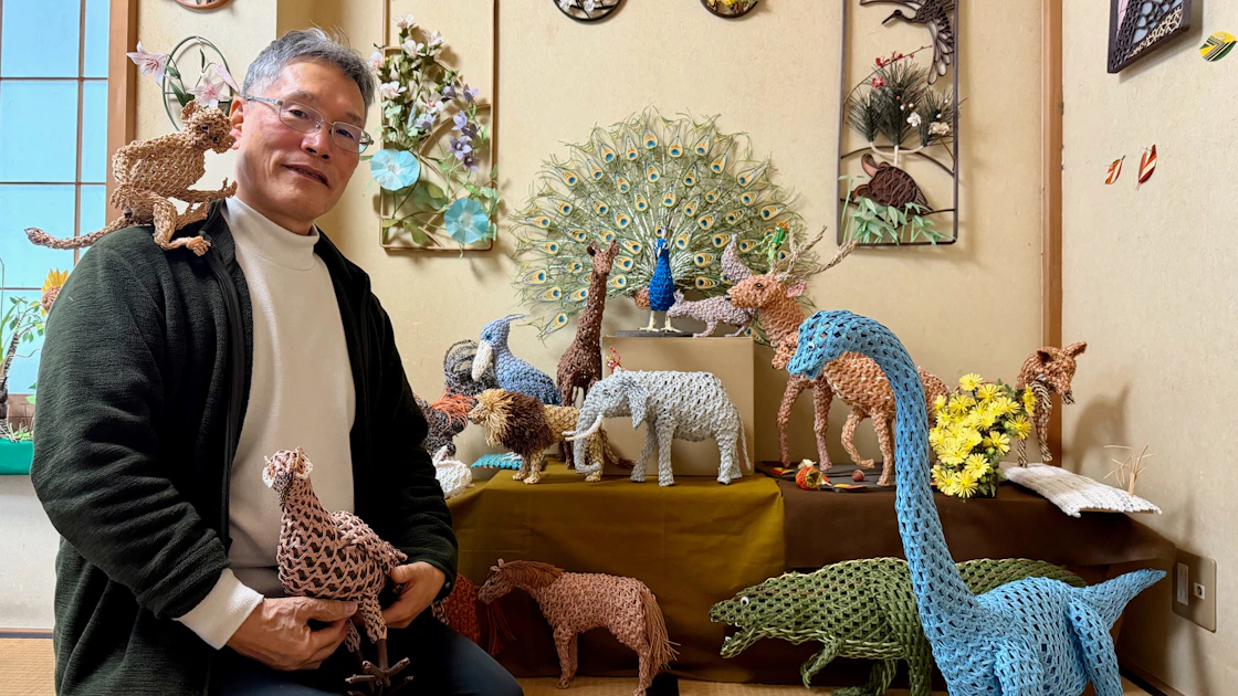 初めて尾上弘(おのうえ・ひろし)さんの作品を目の当たりにしたとき、不思議な感覚に陥った。そこに鎮座するのは、カブトムシやキリン、あるいはいまにも跳ねそうな鯉。その生々しい造形が、じつは「紙バンド」という、手芸店にある事務的な素材で編み上げられている。たんなる模写ではない。生き物の骨格を一度バラバラにし、自分の手で組み立て直したような、理にかなったリアリティがそこにはあった。