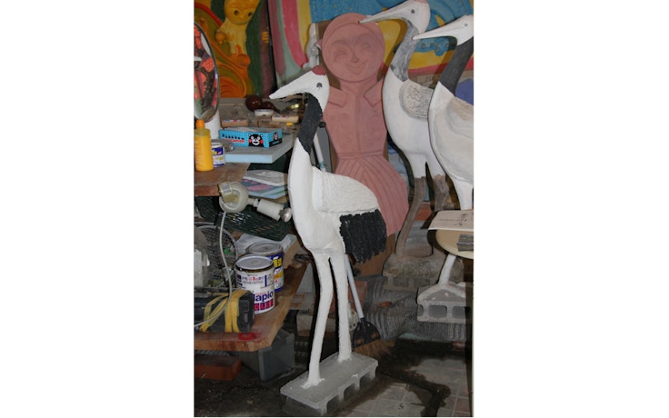 近年は、「出しても落とされるばかりやから」と公募展への出品を取りやめ、2009年からは水田を借りて稲作を始めるいっぽうで、「田んぼにおったら面白かろう」と自宅で制作した鏝絵の鶴をそこに設置した。平面の鏝絵を立体にするのは、とても難しい。鉄筋で骨組みをつくり、セメントで大まかな形を整え、鏝で漆喰を塗って仕上げる。脚は、コンクリートブロックにセメントで固定するなどして工夫した。
