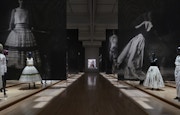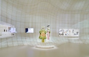 なかでも、東京都現代美術館の特徴である地下と上階をつなぐ吹き抜けのアトリウムを大胆に使用した「ディオールの夜会」は圧巻だ。夜会に欠かせない華やかなドレスたち。ここではヘリテージから現代まで、35体ものドレスが大階段のような舞台に立ち並び、厳かな音楽、時の移ろいを示すプロジェクション・マッピングとともに鑑賞者に向かい合う。