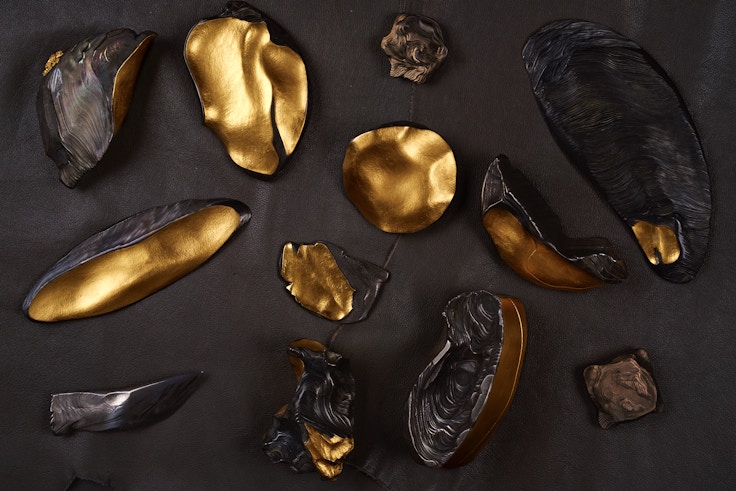 それから時が経って、私たちが結婚することになったとき、彼は金を1オンス買って、本結びのモチーフの結婚指輪をつくってくれました。これが、彼が最初につくった金の作品になります。そこから粒金細工など昔の金細工に興味を持つようになりました。それまで主に行っていた絵画制作は、肉体的にも精神的にも負荷が高い作業でした。金の研究は、気を静め、頭を切り替えるのにちょうど良かったのです。ところが徐々に、メタルワークにものめり込むようになり、最終的にどちらにも膨大なエネルギーを注ぐようになりました。
