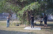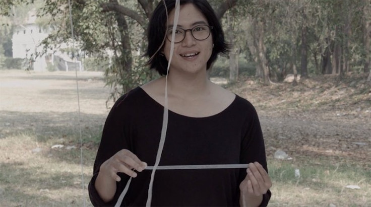 「あなたと愛について話したいんです」と、率直な言葉で対話がはじまる。半透明なリボンが木の枝から垂れ下がり、黒い服を着た女性が白いタイルの上に裸足で立っている。この映像作品は、地主麻衣子がタイのチェンマイに滞在し撮影したものである。本展会場では、映像とともに二人が話をしている舞台が再現されており、自然と鑑賞者は愛について問われ、このささやかな対話篇の当事者となるよう誘われる。