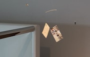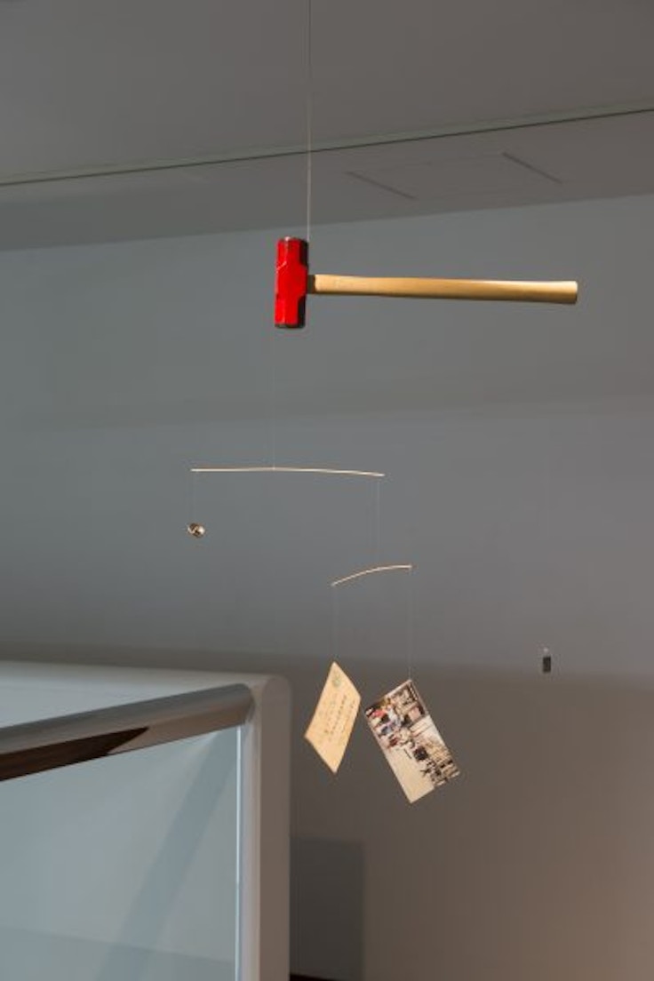 何から始めるべきか。本展は作品同士にあるつながりを順に追うほうがよい。まず階段を降りると、モビールが吊るされている。水平の金槌に、古代ギリシャでは打刻され、近代に復活し鋳造されたドラクマ硬貨と、江戸時代に銀貨の鋳造所のあった銀座で流通した一分銀が括られる。戦前に書かれた2枚の手紙に分岐し、1つには香料会社への注文が綴られている。
