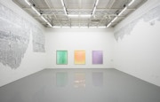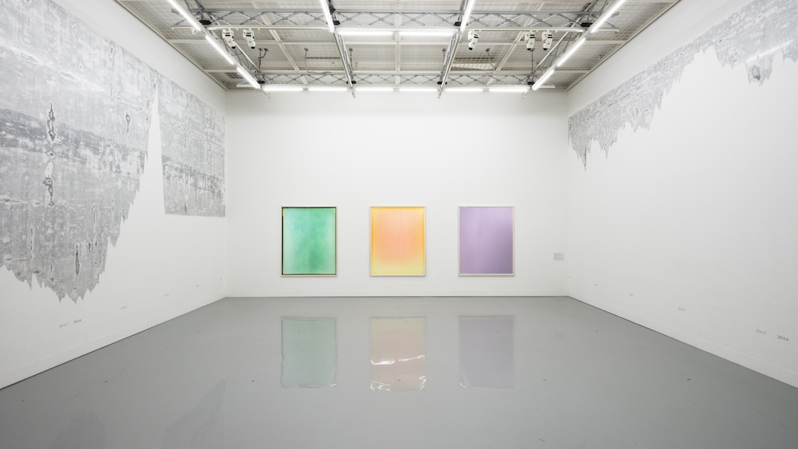 川久保はこうした時空間のノードでバランスをとり、それぞれの作品を結びつけようとする。会場の両壁には経済予測の折れ線グラフが引かれ、分割されたホワイトキューブの上半分を削ることで滝のような図がつくられている。手で直接触れることのできる研磨された表面は、感触がよく滑らかである。その先で照明のような色が目に飛び込んでくる。それが放射線量の高い福島の土に埋められたフィルムの化学変化だと知れば、目を眩ませた鮮やかさが空ろであることに気づくだろうか。グラフが示す固定化される日本の長期金利はダイダロスの飛行、それによって弓なりに落ちる米ドル/円相場はイカロスの墜落、そして福島第一原子力発電所事故はヒンドゥー教の破壊神を表す「千の太陽の光」へと蓋然的に重ねられる。