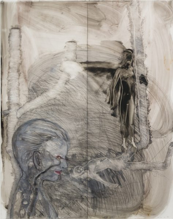 二つに分かれた透明な支持体の上で、隔てられながらも重なり合おうとする男女。暗闇から突き出る拳、割れるガラス。上部には涙を流す女性、下部には横たわり内臓が透けた身体をもつ男性が描かれている。