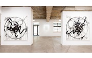 本展の新作において探索される表現を取り出していこう。会場に入ると1.着色されたキャンバス上の偶然的なひび割れを含む「面」が、メカニカルペンシルで慎重に浮かび上がらされたミクロな「線」のうっすらとした連結によって覆い尽くされている。2.肩を中心としてかかれた回転する「線」すなわち円が、エアブラシの微細な飛沫で塗りつぶされた「面」のマットな連結によってスクラッチされている。3.同じく肩の回転、あるいは手首のスナップで引かれたOやSのような筆跡の上に散らばる「点」が、角度のついたフィルを持つ84の小さな「立体」の星座にも似た連結によって多方向化されている。